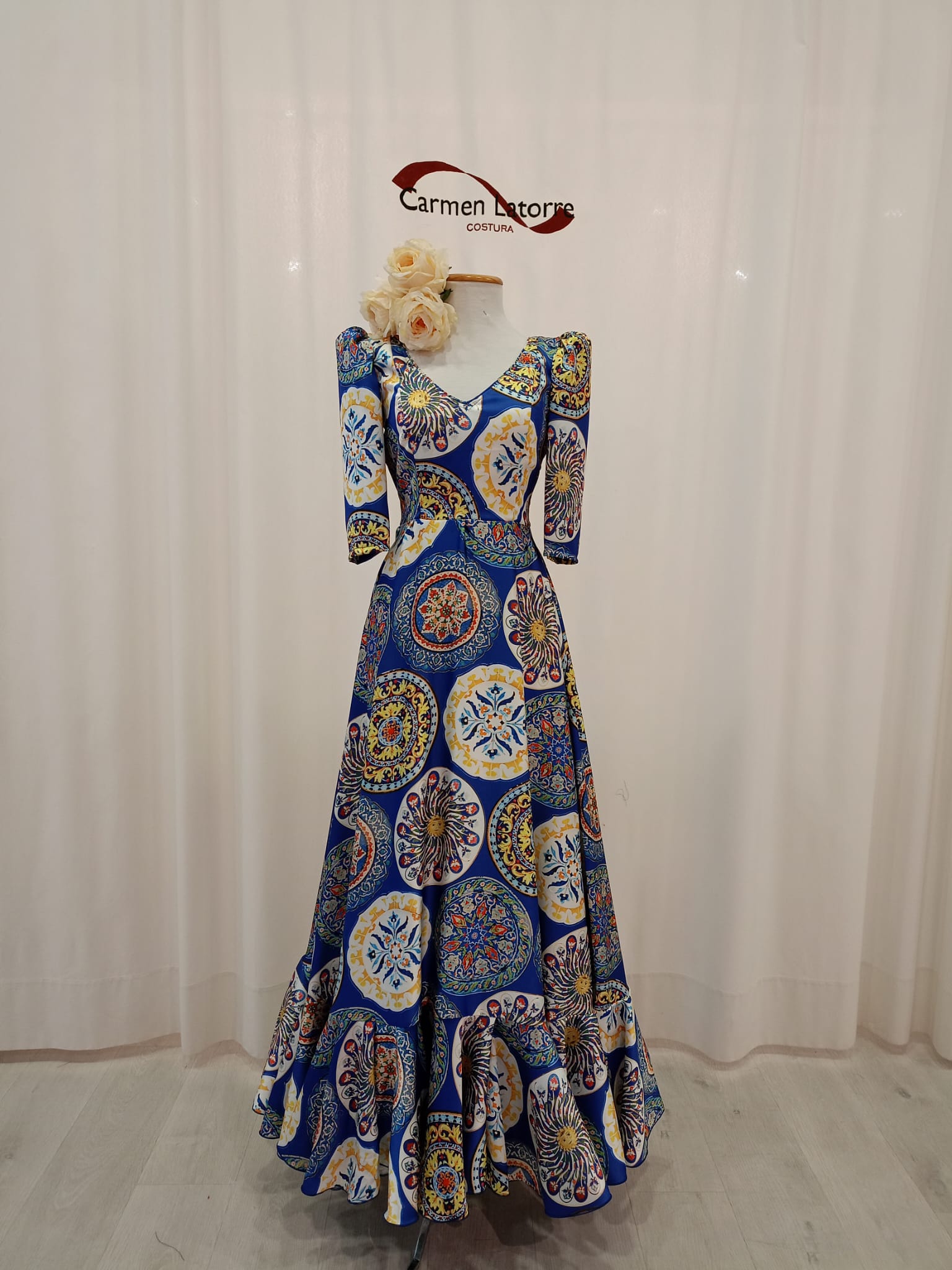 Bata de capa rociera con un volante y estampado de platos cartujanos en saten de licra.