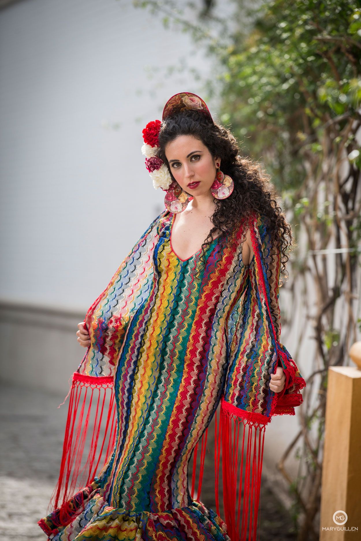 Vestido de dos volantes de capa en ganchillo multicolor, con forro de lycra y gualdapolvos enflecado en los bajos de color rojo. El traje es sin mangas para dejar lucir la prenda externa en todo valor artesanal.