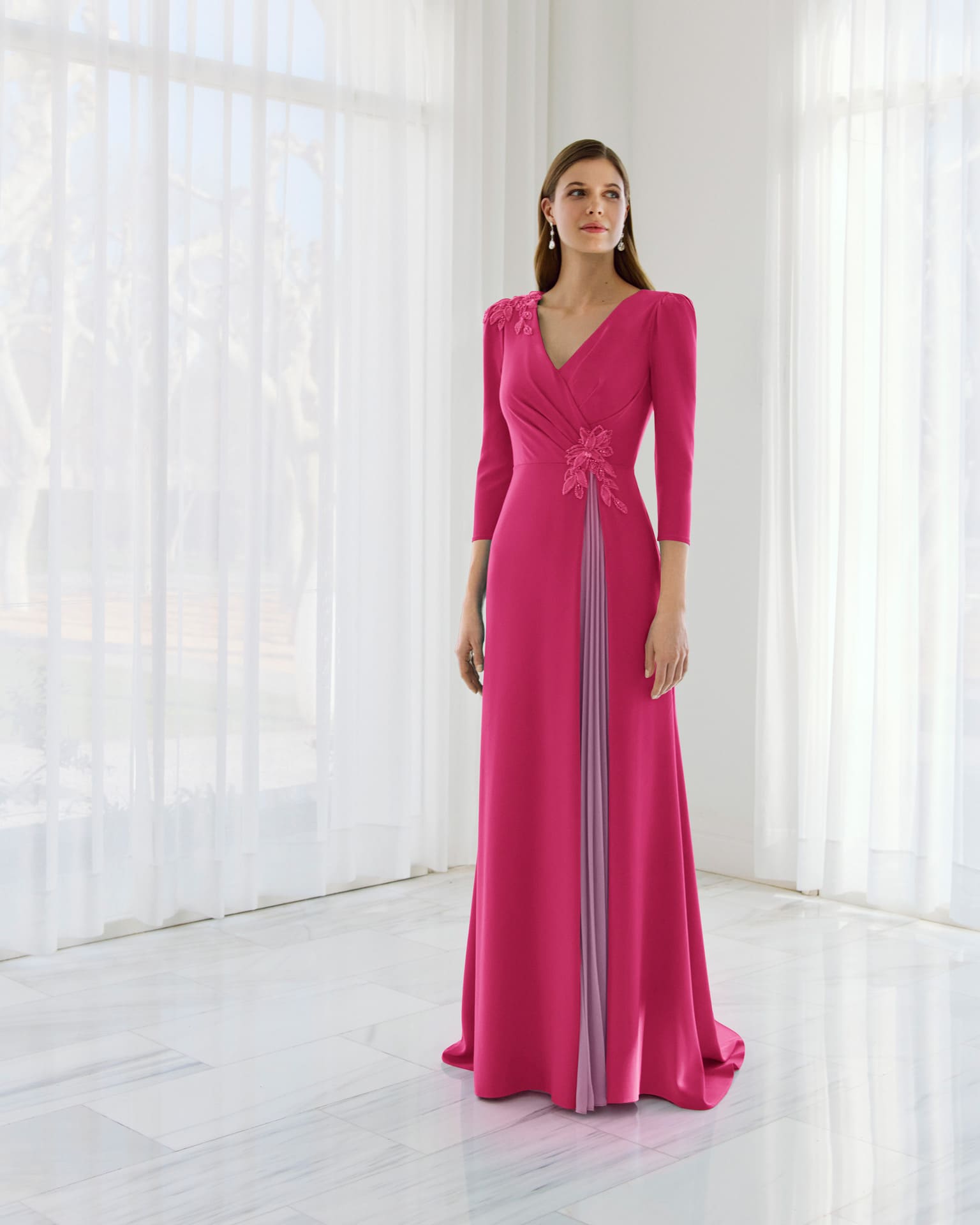 Vestido de fiesta largo de Couture Club, realizado en crepé con pedrería, pensado para realzar la figura con elegancia. El escote en pico estiliza el torso, mientras que la manga 3/4 y la espalda cerrada aportan un aire clásico y refinado. Una opción atemporal para ocasiones especiales.