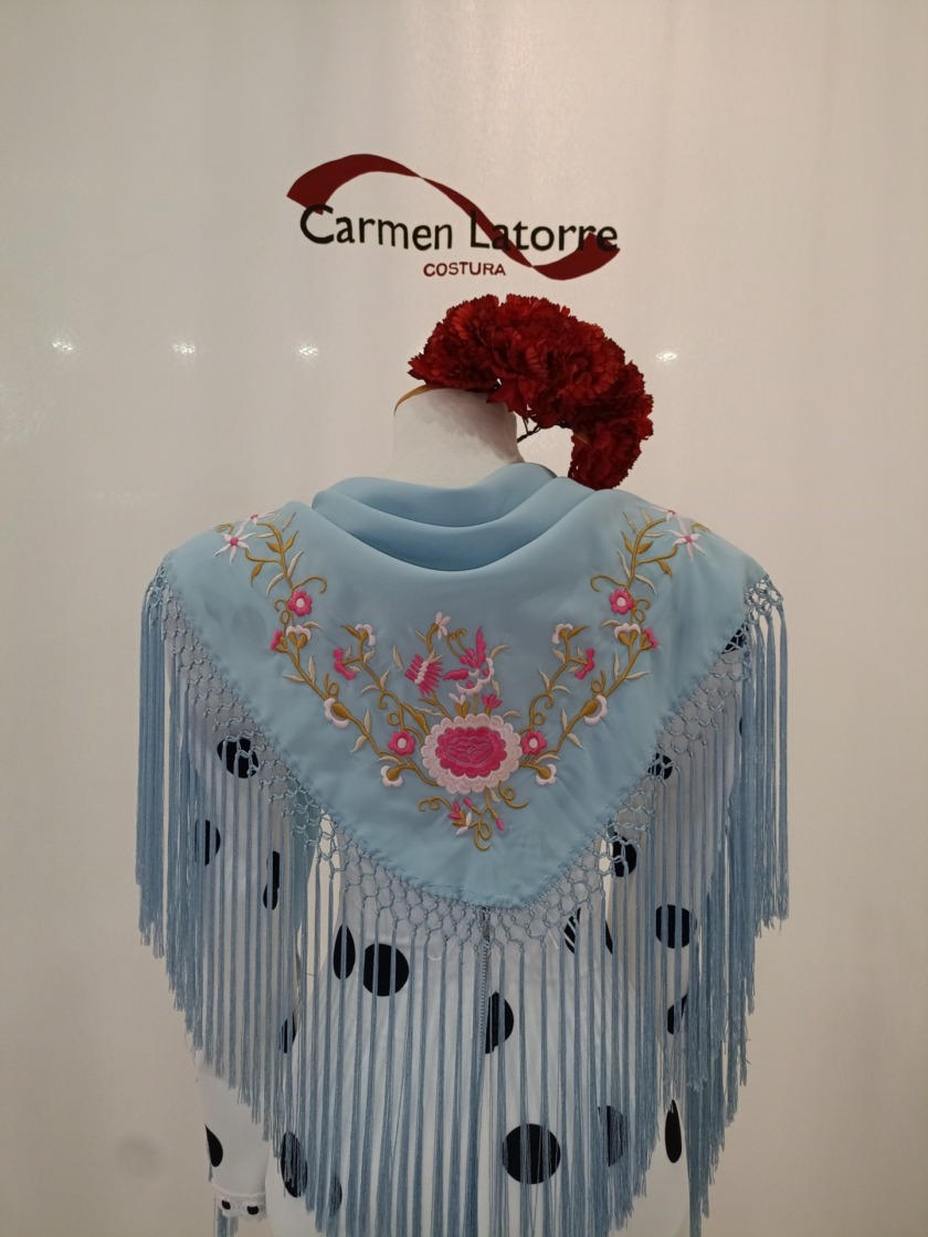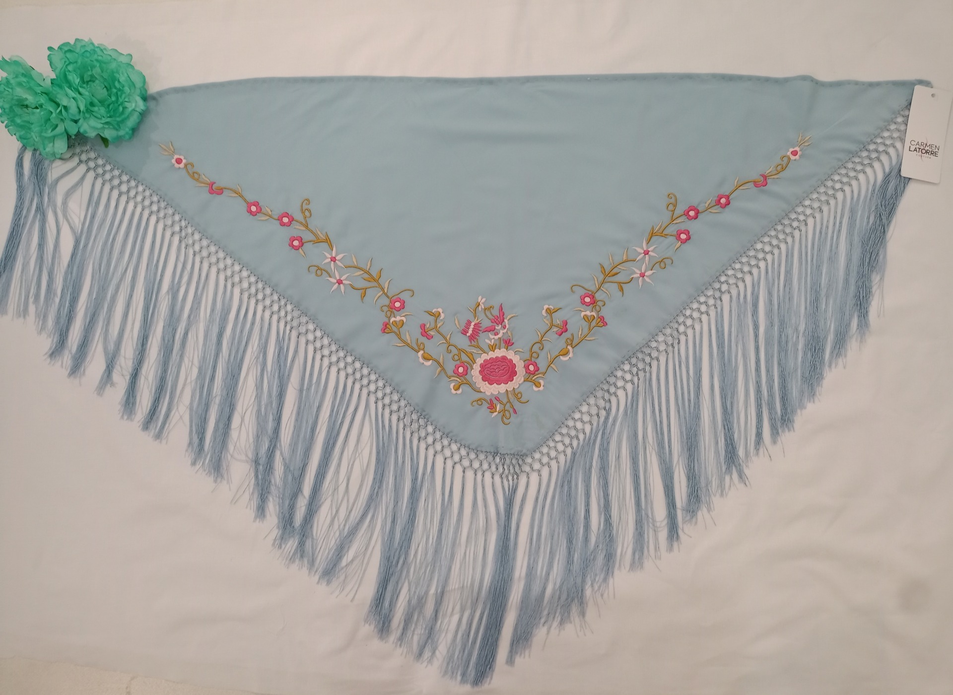 Mantoncillo de señora azul celeste, modelo mariposa con bordados en blanco, mostaza y rosa.