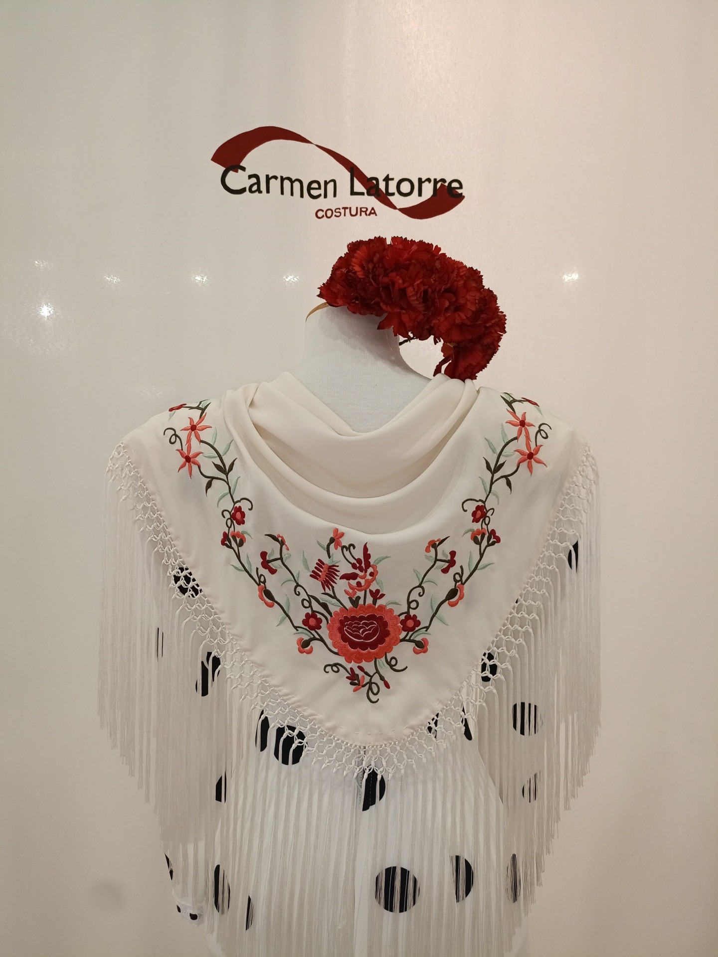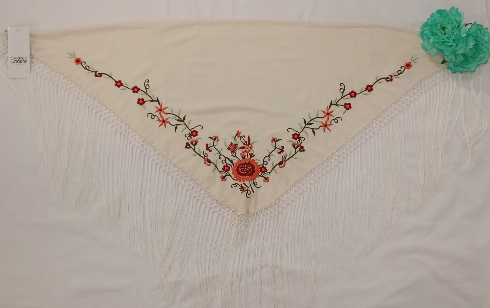 Mantoncillo de señora crudo, modelo mariposa con bordados en coral, rojo y verde.