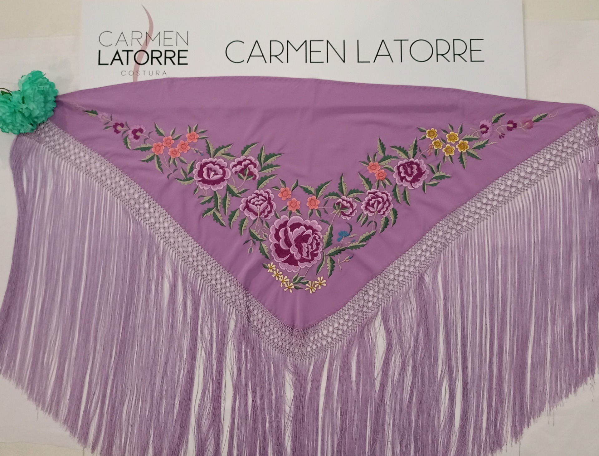 Mantoncillo de señora malva, modelo Azo con bordados en tonos morados y verdes.