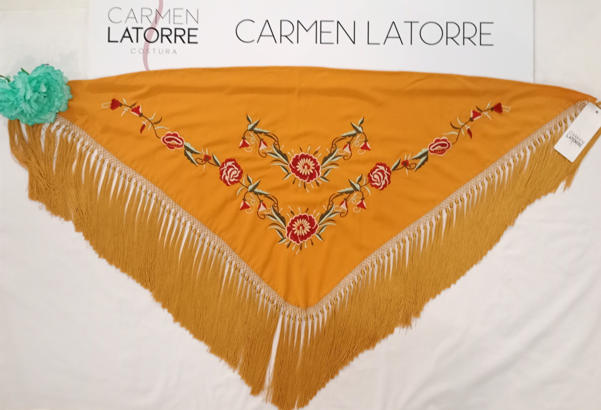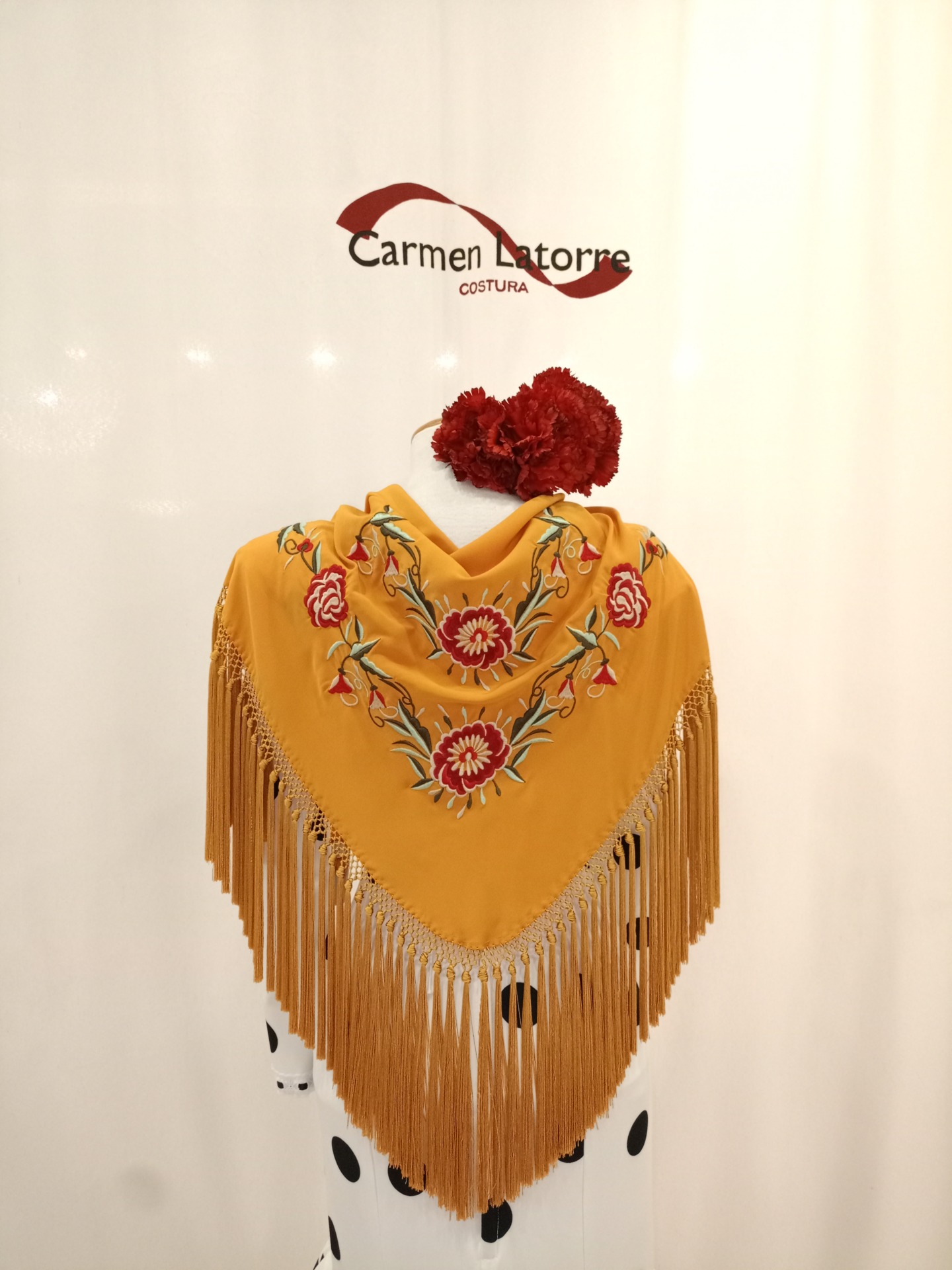 Mantoncillo de señora mostaza, modelo Aires con bordados en rojo y verde.