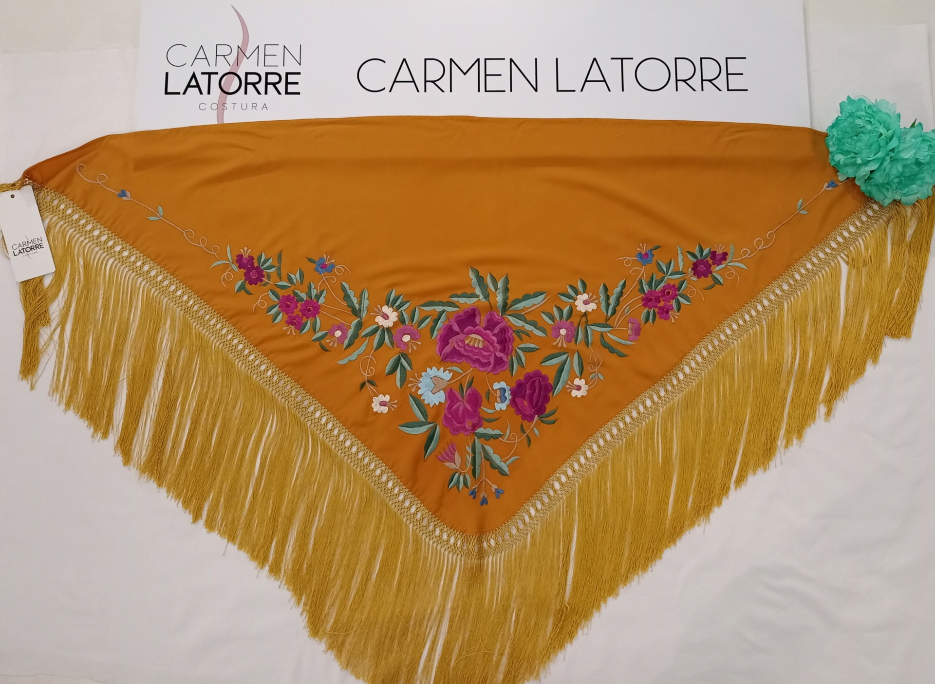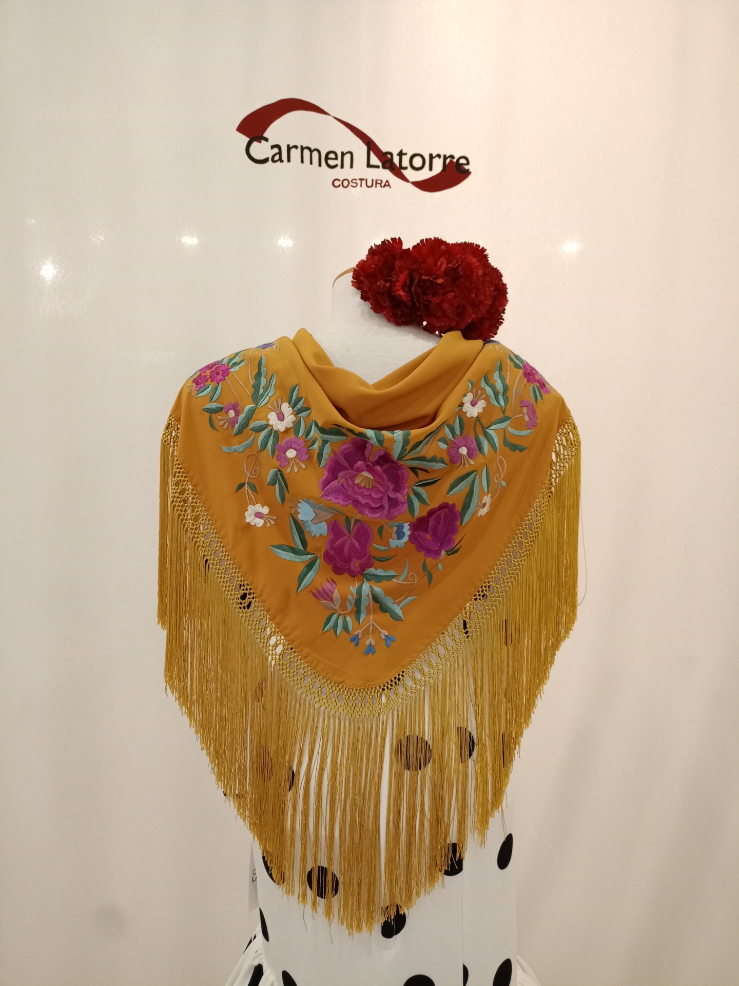 Mantoncillo de señora mostaza, modelo Azo con bordados en tonos morados y verdes.