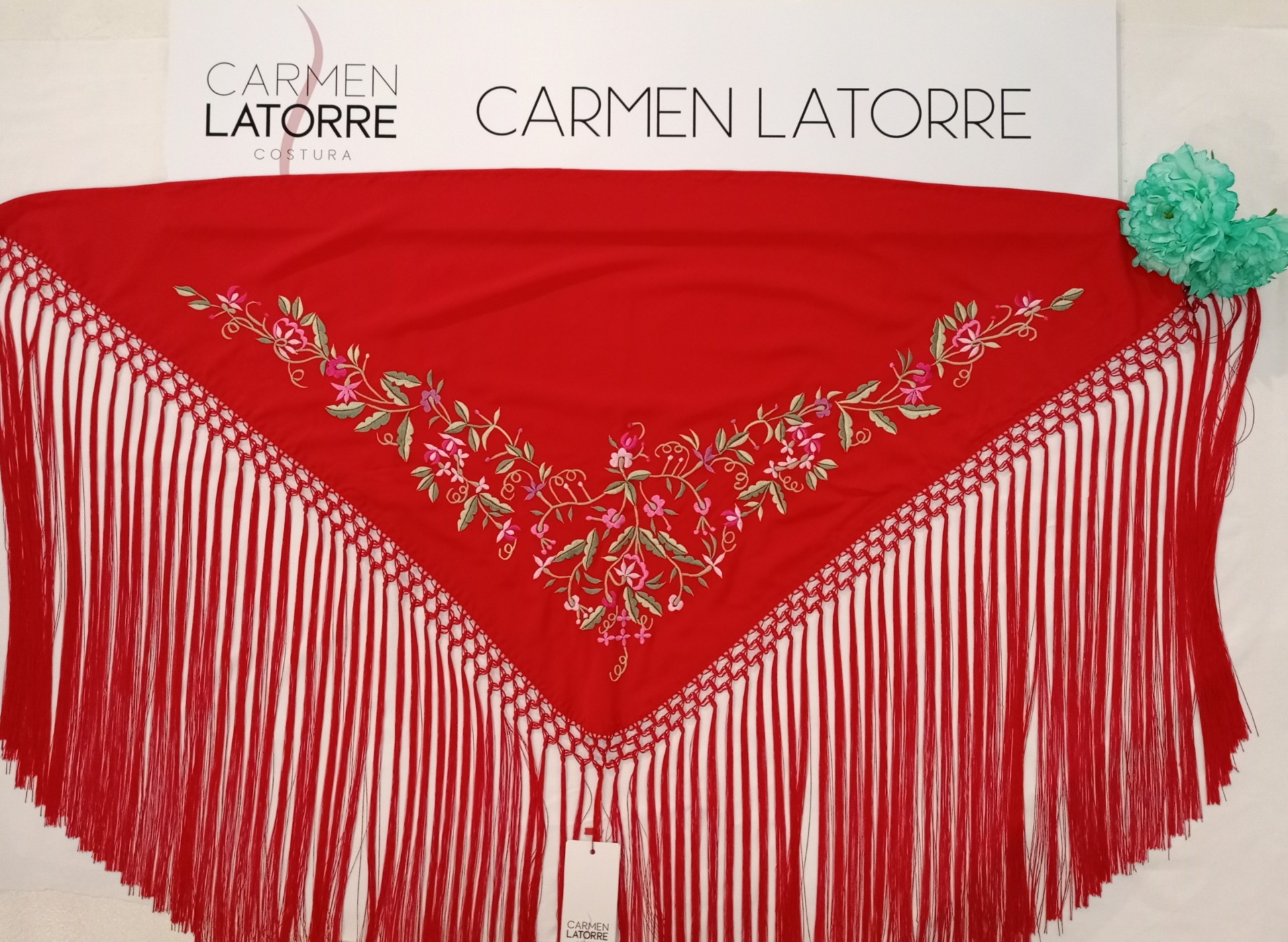 Mantoncillo de señora rojo, modelo Sanjo Simple con bordados en tonos rosas y verdes.