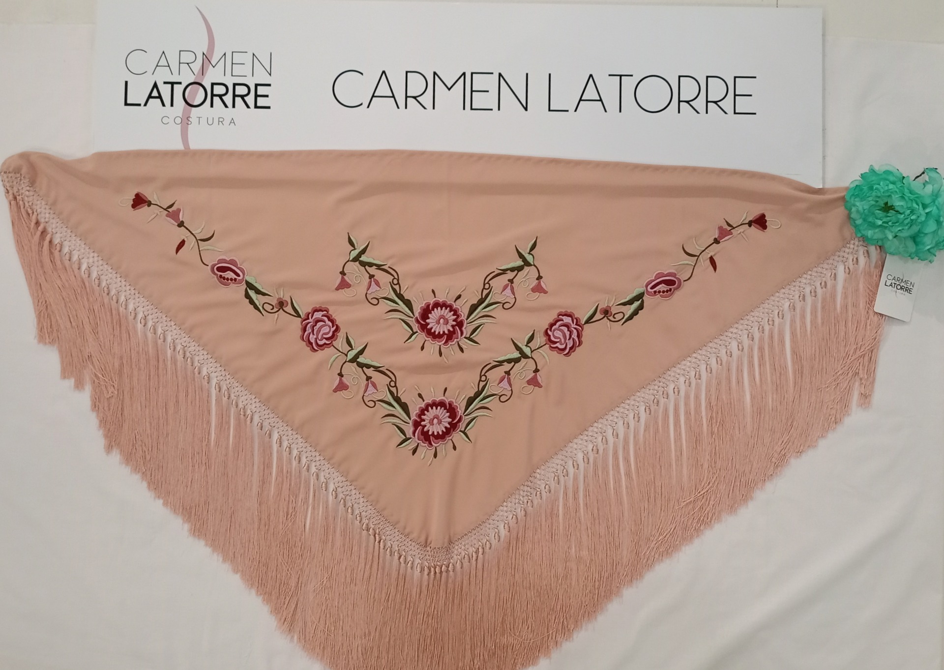 Mantoncillo de señora rosa bebe, modelo Aires con bordados en rojo y verde.