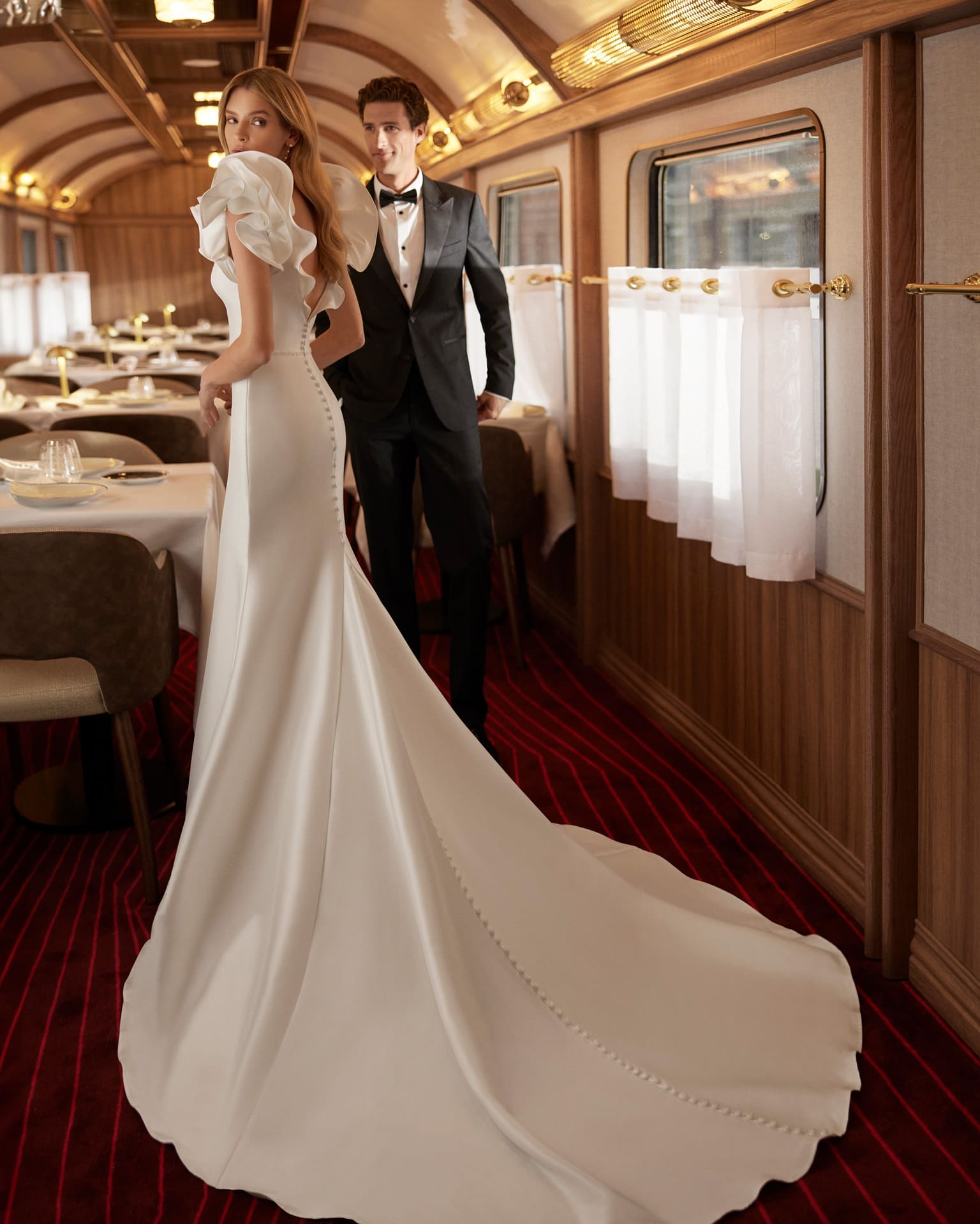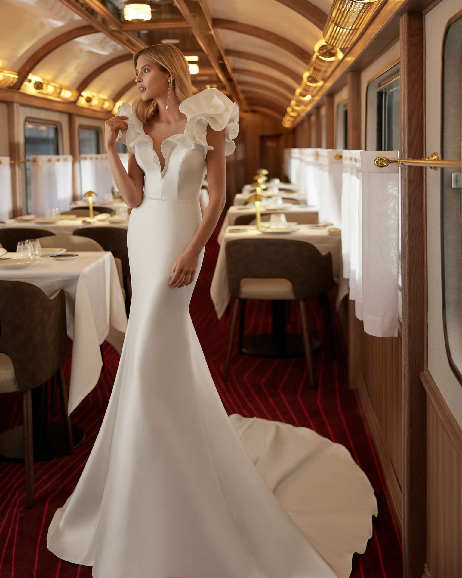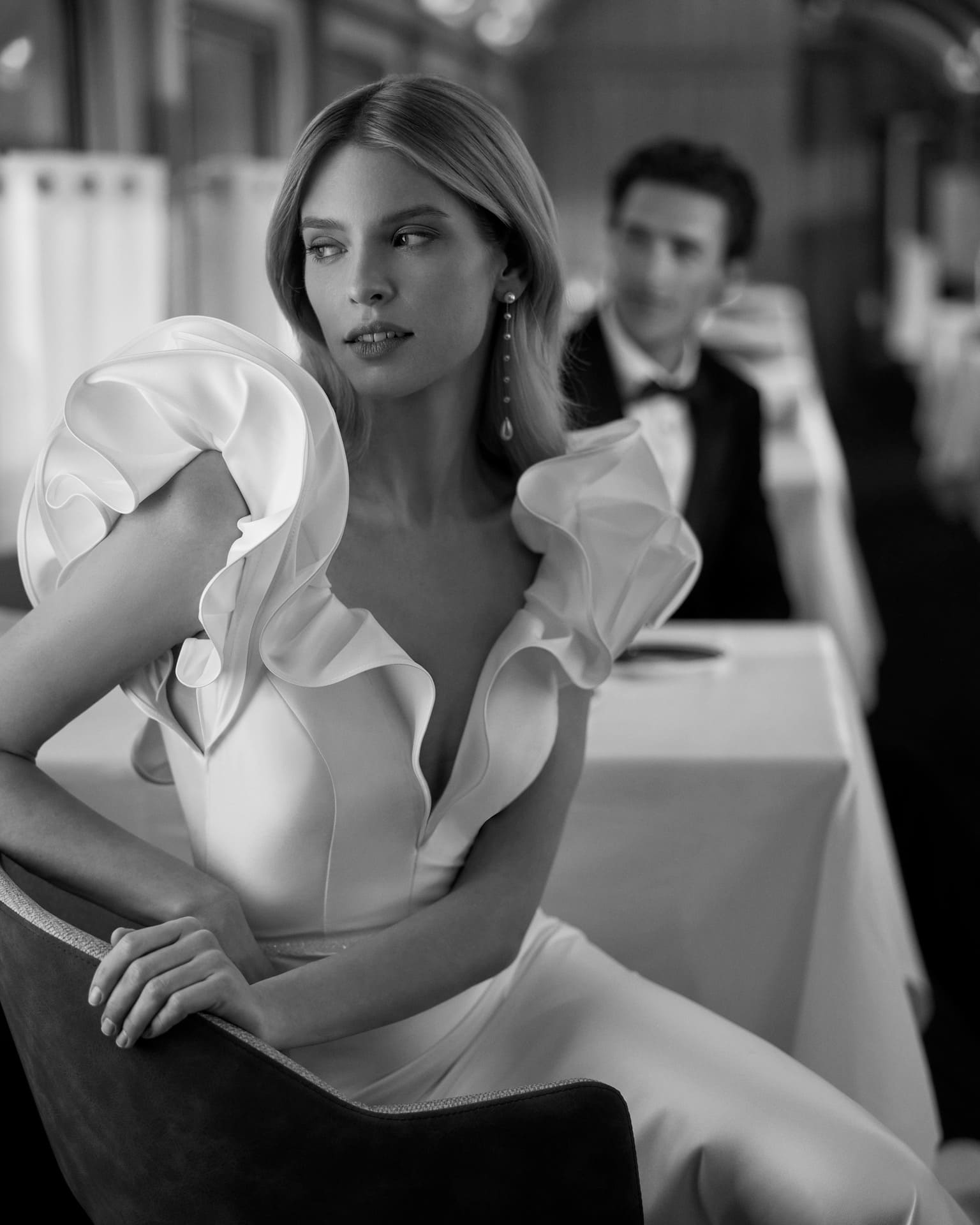 El vestido de novia VIOLETA de Aire Barcelona es puro glamour contemporáneo. Su corte sirena en mikado elástico envuelve la figura con sofisticación, destacando el escote en V y la espalda abierta para un toque sensual. Las mangas con volantes añaden volumen y un aire único, ideal para novias que desean destacar con elegancia en su día más especial.