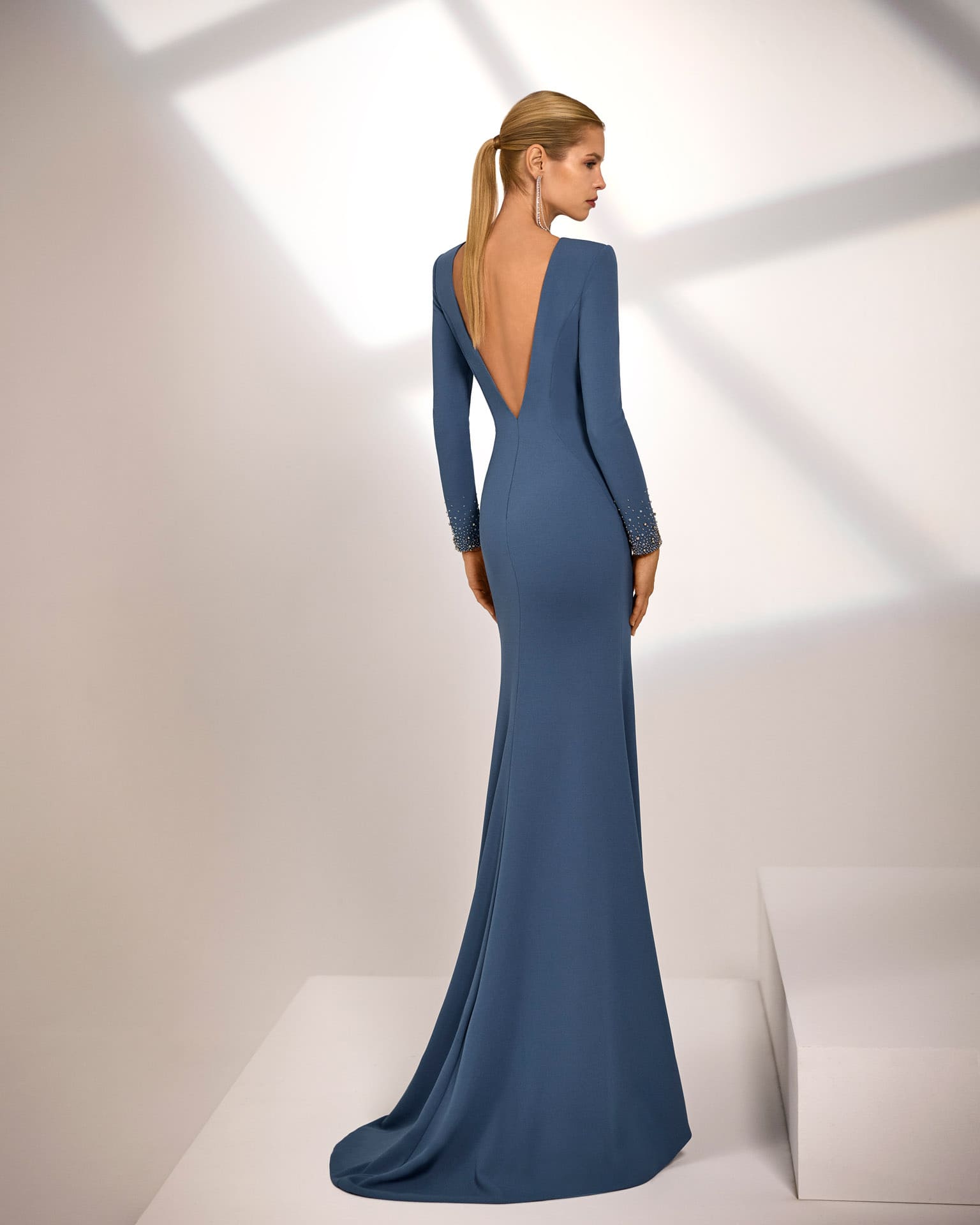 Vestido de fiesta largo de Marfil, confeccionado en crepé elástico, que se adapta cómodamente a la silueta. Su escote ilusión aporta delicadeza, combinado con manga larga y una espalda escotada que equilibra elegancia y feminidad. Ideal para eventos de noche.